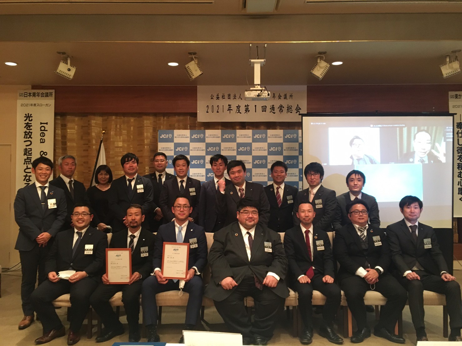 2021年度理事長 日下 奉哉(くさか ともや)、直前理事長 長町 雅人からの挨拶から始まり、2020年度の事業報告、決算報告のほか、2021年度の理事長所信、スローガン、事業計画などが全会一致で承認され、2020年度の締めくくりと、2021年度のスタートが切れた総会となりました。